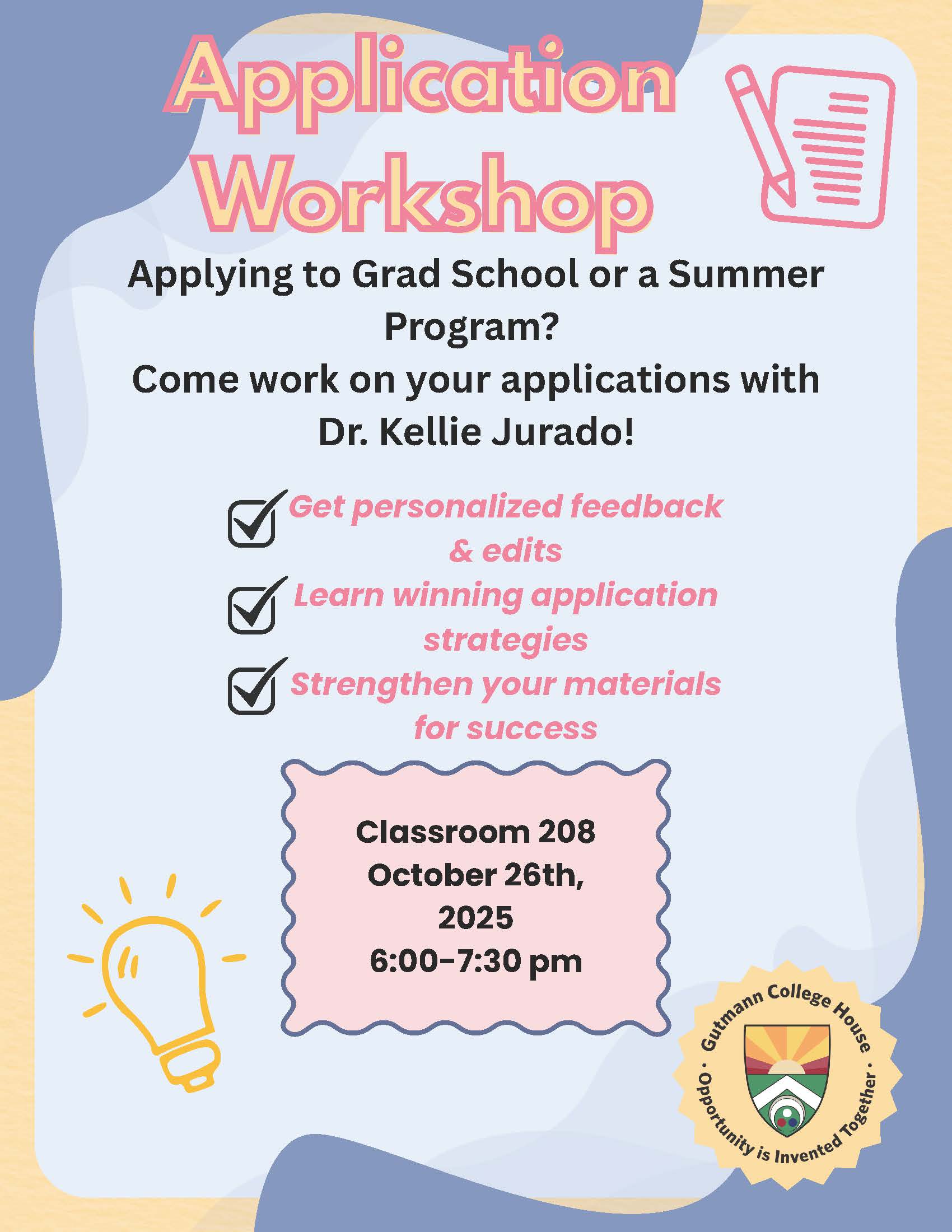 Are you applying to graduate school or a summer experience this coming Fall? Please join Faculty Fellow Dr. Kellie Jurado for a space to work on application materials! Get one-on-one feedback, edits and insight into common themes/strategies in crafting the best application materials!