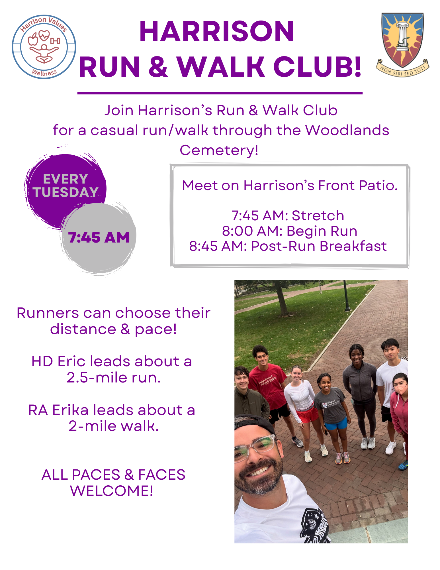 Join House Director Eric for a casual run through the Woodlands Cemetery! You can run, jog, or walk - all paces and faces are welcomed! Meet at 7:45 AM on the Harrison Front Patio. Run will be around 8:00 AM. We will run to, and then around, the Woodlands Cemetery grounds, before returning to campus. Residents can choose their own millage, but most runs will be between two and four miles.
